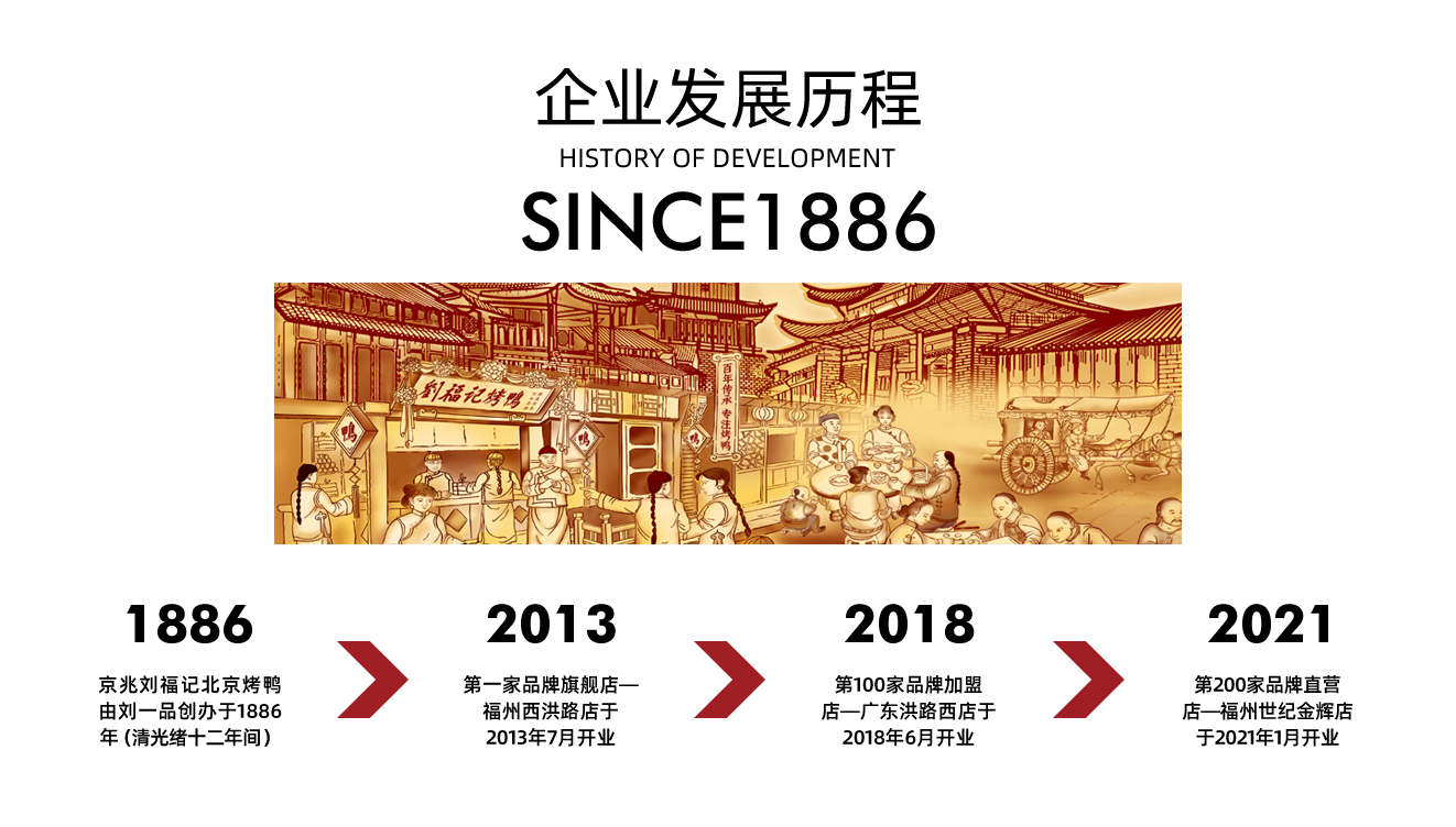 京兆劉福記北京烤鴨,始創(chuàng)于1886年,現(xiàn)隸屬于福州劉福記餐飲管理有限公司,公司成立于2013年,現(xiàn)已成為是一家集餐飲運(yùn)作、廚師培訓(xùn)、原料配送、品牌推廣、飲食文化研究為一體的企業(yè)。公司在總經(jīng)理劉磊先生的帶領(lǐng)下,嚴(yán)格恪守“傳承、創(chuàng)新、創(chuàng)造”的企業(yè)核心價(jià)值觀,堅(jiān)秉“利在傳承,重在質(zhì)量”的經(jīng)營理念,依靠品牌、技術(shù)、資本、人才等優(yōu)勢,全面實(shí)施“多品牌運(yùn)作,特許加盟和直營連鎖經(jīng)營戰(zhàn)略”, 成功地走出了一條“品牌化、規(guī)模化”的發(fā)展道路,目前有500余家直營及加盟連鎖餐飲經(jīng)營規(guī)模,并不斷擴(kuò)大市場份額。